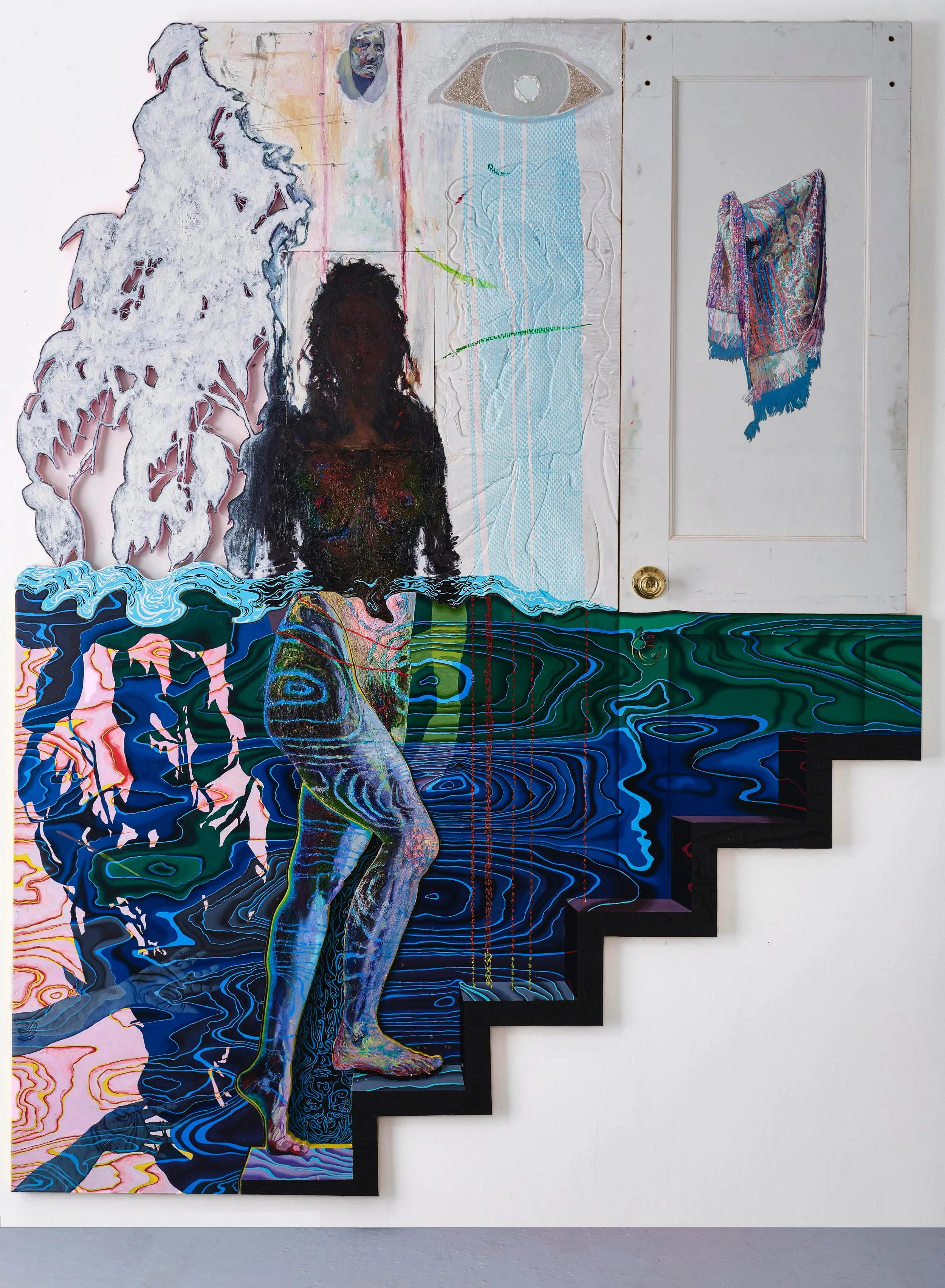 "At The Other Side Of The River" | 96” x 72” x 4” | oil, glue, acrylic, mica, on shaped panel, linen, and door | 2022 | available to view in Hoboken, NJ until April 7th